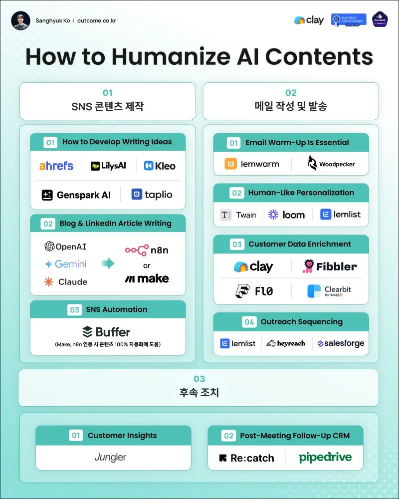 이후 블로그나 링크드인 아티클은 GPT, Gemini, Claude 등을 활용하되, n8n이나 Make로 자동화해 자료를 축적하면 훨씬 효율적으로 작성할 수 있습니다.