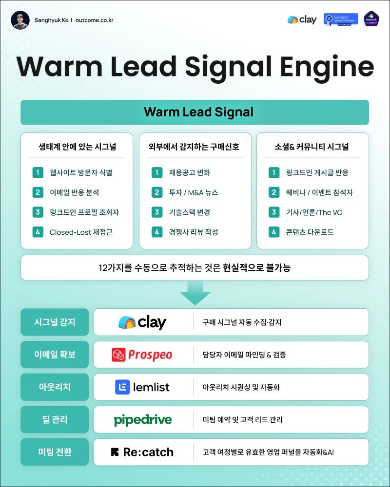 이번 글에서는 웜 리드(Warm Lead)를 자동으로 발견할 수 있는 12가지 시그널 소스를 정리했습니다.