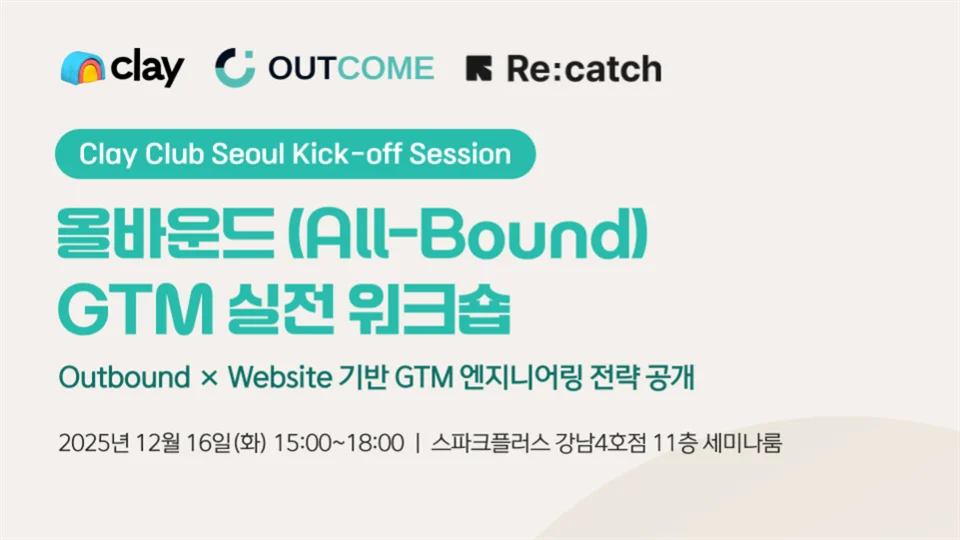 이번 행사는 글로벌 GTM 플랫폼 Clay, 한국 공식 파트너 Outcome, 그리고 웹 & CRM 전문 기업 Re:catch가 함께하는 실전 중심 워크숍으로 구성됩니다.