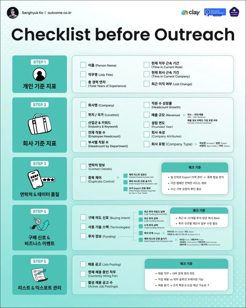 Clay와 Prospeo.io에서 자주 사용하는 필터 기준만 모았습니다.