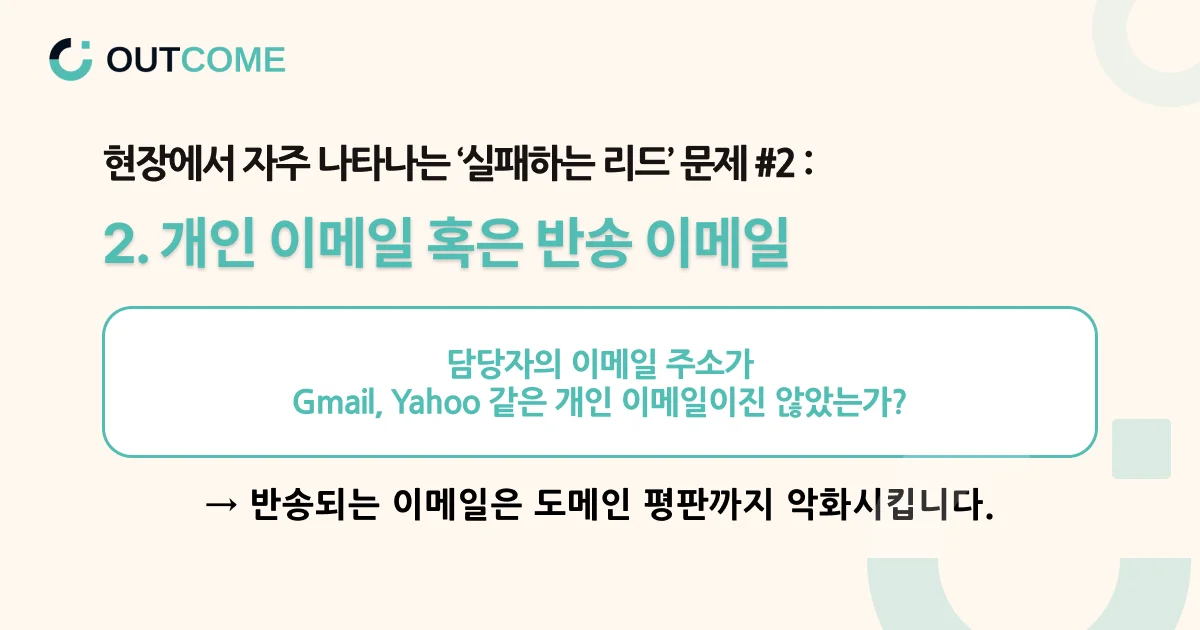 기업 거래에서 신뢰도를 떨어뜨릴 뿐 아니라, 반송되는 이메일은 도메인 평판까지 악화시킵니다. 이는 이후 전체 아웃리치 성과에 부정적인 영향을 미치는 구조적인 문제로 이어집니다.