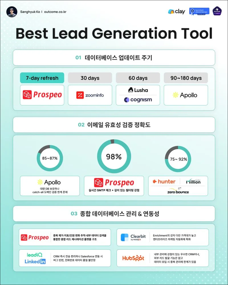 결론적으로 Prospeo.io와 같은 종합 리드 제너레이션 툴을 중심으로 Clay, lemlist, CRM을 연동하는 구조를 만든다면 아웃리치 도달률과 ROI를 극대화할 수 있습니다.